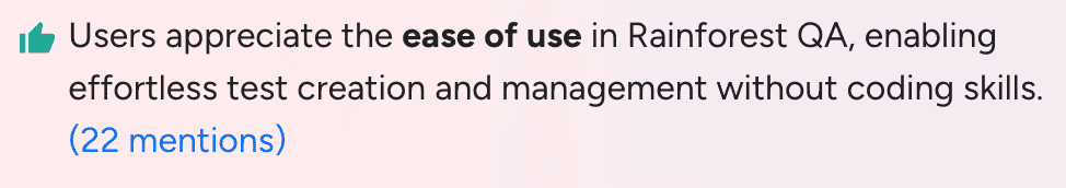 Rainforest is AI-driven and codeless, with tests written in plain English so anyone can contribute to QA. Rainforest’s AI is also deterministic (unlike many competitors), so you know it will catch real bugs rather than papering over them. The platform is AI-driven but keeps humans in the loop with full visibility into what the AI did and why, so strategic decisions can be made about risk and prioritization. Rainforest boasts fast time-to-value, with teams able to run their first tests in hours. Visual-layer testing catches what code-level tools often miss, reducing false positives from minor UI shifts. Last but not least, Rainforest is widely praised for its industry-leading customer service.
