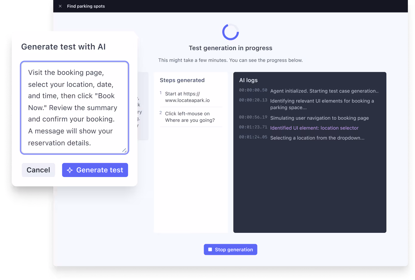 Feed in a URL and prompt, and get complete, ready-to-run tests instantly.