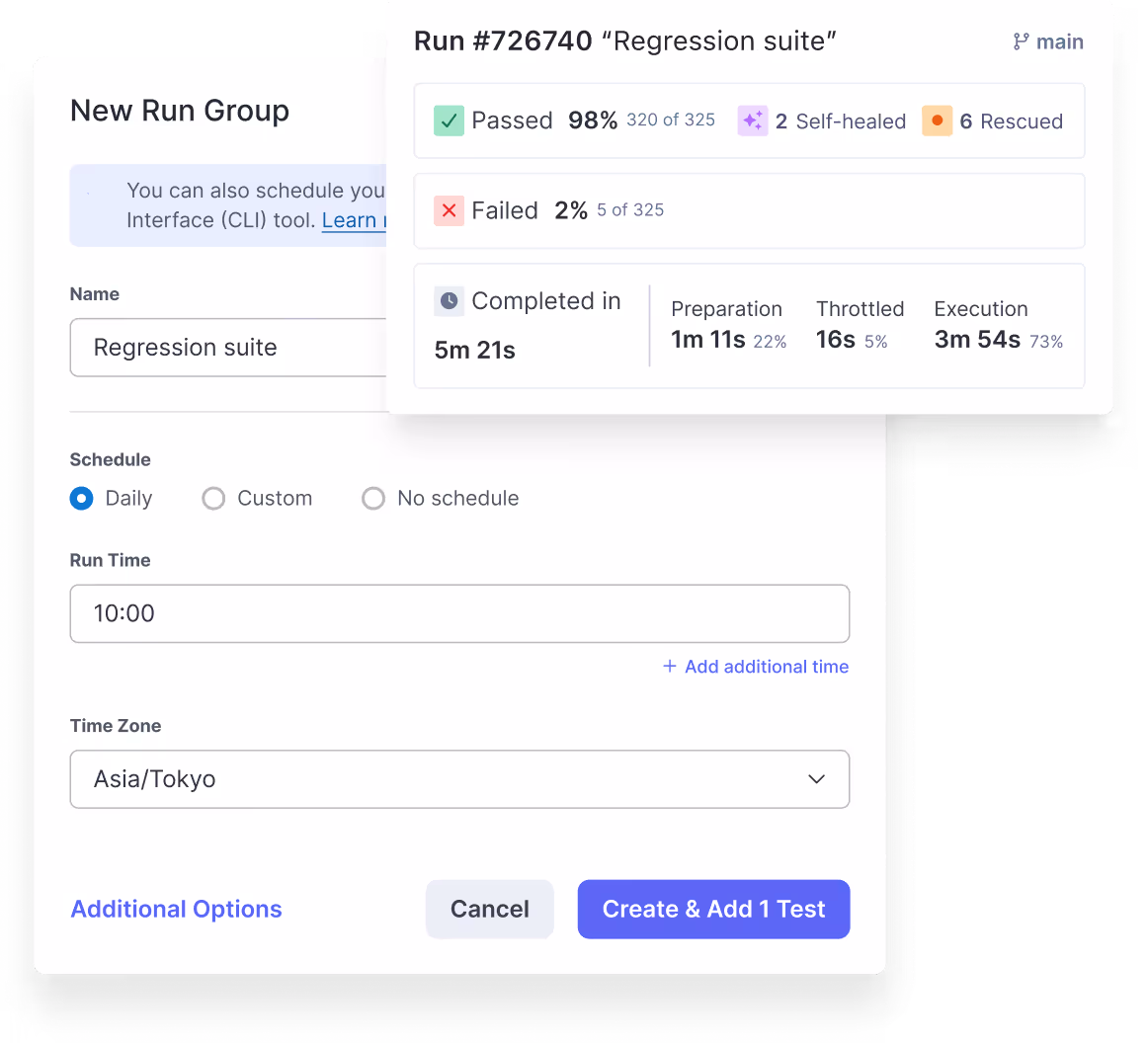 Run automated tests on-demand or on a schedule, or hook right into your CI tool.